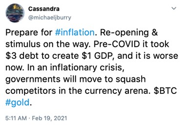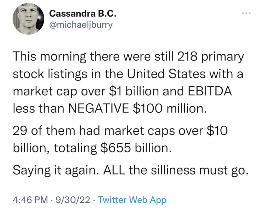 Beginning in early 2021, Michael Burry warned repeatedly about inflation. Unfortunately, Jerome Powell and Janet Yellen were not listening! More and more dollars were pumped into the economy while the economic engineers declared first that there was no inflation, then, that it was “transitory.” Now, our economy is being forced into a recession by repeated interest rate hikes to stop runaway inflation. Of course, the side effect is a knee-capped stock market and job market.