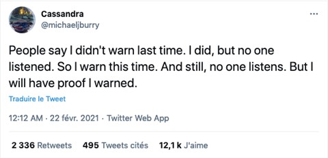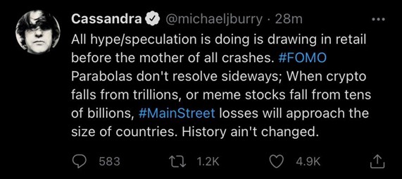 Since 2021, Burry’s conviction has grown stronger and his warnings more dire. In early 2021, he changed his Twitter name to “Cassandra” after posting a tweet saying he has warned, but “still, no one listens.”