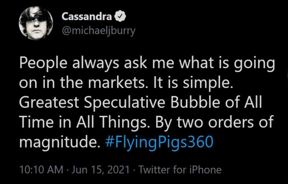 By 2022, headline news was finally echoing the warnings Burry had been posting for months. “Transitory, no. Peak, no. To the moon? If you mean a cold dark place,” Burry said in a since-deleted tweet using the “moon” language of meme-stock and crypto fans. (Burry often deletes his tweets, although the “Burry Archive” account captures them.)